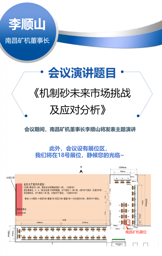 南昌礦機(jī)董事長(zhǎng)李順山將出席會(huì)議,發(fā)表以《機(jī)制砂未來(lái)市場(chǎng)挑戰(zhàn)及應(yīng)對(duì)分析》為題的主題演講。會(huì)議設(shè)立集中展示區(qū),南昌礦機(jī)將在18號(hào)展位進(jìn)行企業(yè)展示,靜候您的光臨。