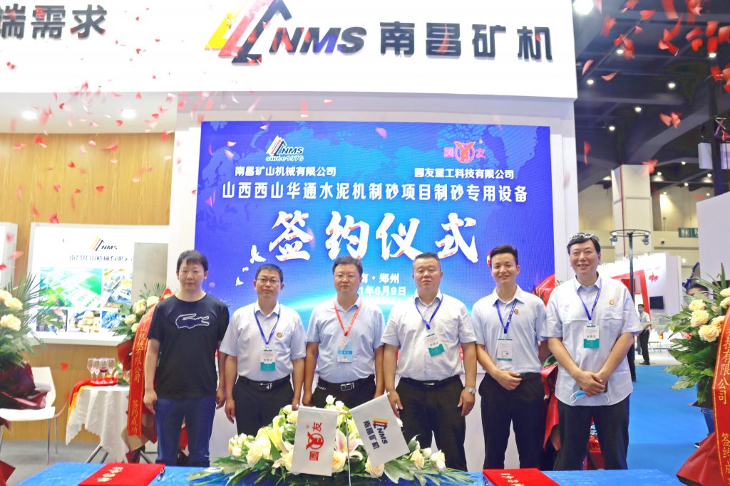 ? ? 9號(hào)上午,南昌礦機(jī)展位舉辦了山西西山華通水泥機(jī)制砂項(xiàng)目制砂專用設(shè)備簽約儀式,南昌礦機(jī)總裁龔友良與山東圓友重工科技有限公司(下稱“圓友重工”)副總經(jīng)理李冠堅(jiān)進(jìn)行了簽約,標(biāo)志著展位上展出的HFS液壓高頻篩和VSD雙腔立軸破碎成功售出。