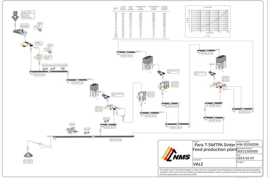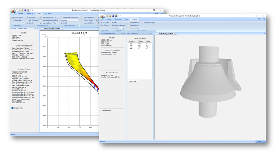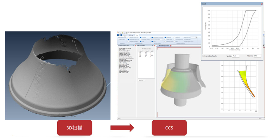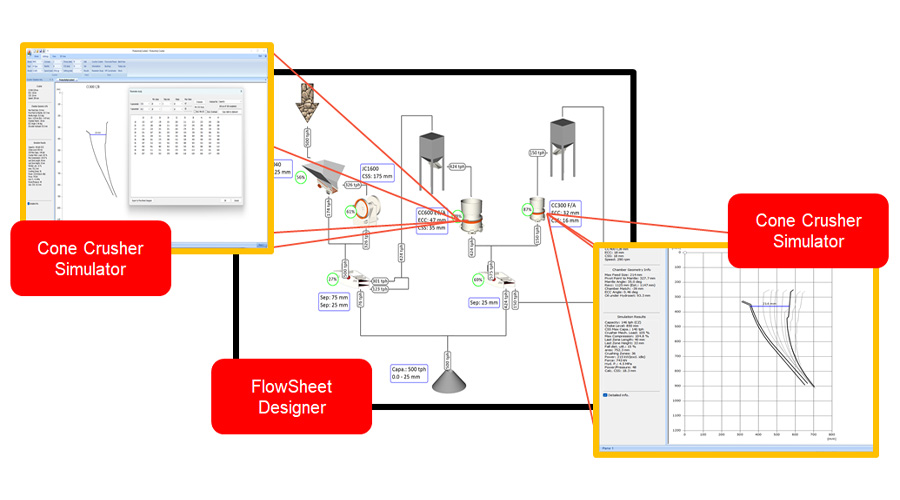 結(jié)合信息化技術(shù)開發(fā)出的一款具有自主知識產(chǎn)權(quán)的破碎機設(shè)計優(yōu)化模擬軟件Cone Crusher Simulator,配合NMS的流程設(shè)計軟件Flow sheet designer提供設(shè)備生產(chǎn)性能預測,為前期工藝流程設(shè)計中的設(shè)備選型提供有效的數(shù)據(jù)支撐,降低工藝設(shè)計期望與實際生產(chǎn)效果之間的差異。